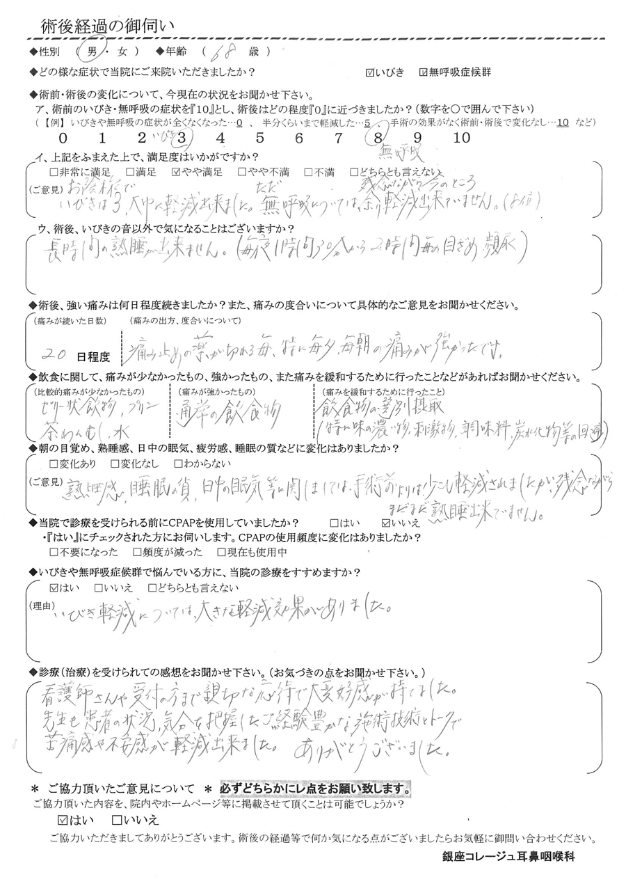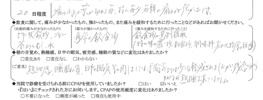 (ご意見) 熟睡感・睡眠の質・日中の眠気等に関しては、手術前よりは少し軽減されましたが、残念ながらまだまだ熟睡出来ていません。