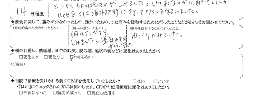 (痛みの程度について) とにかくしょっぱいものがしみました。いつ良くなるか心配でしたが、14日目には海外旅行に行って、ワインを飲みました。