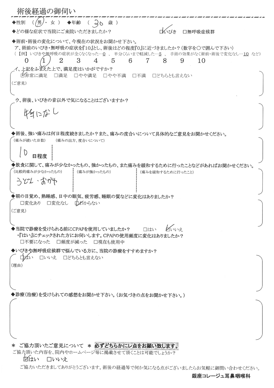 ア, 術前のいびき・無呼吸の症状を『10』だったとすると、術後はどの程度になりましたか? 【1】