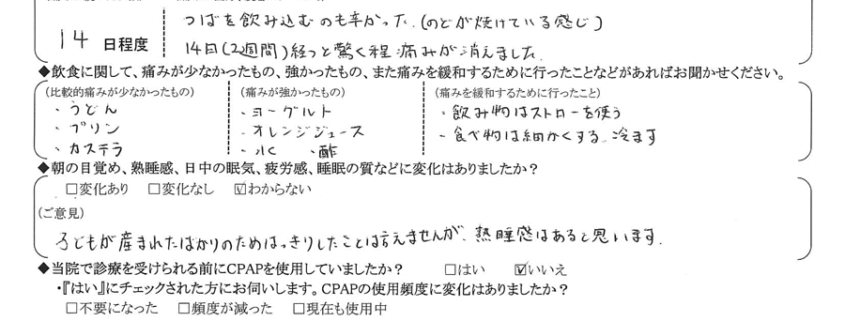 (痛みの程度について) つばを飲み込むのも辛かった(のどが焼けている感じ)