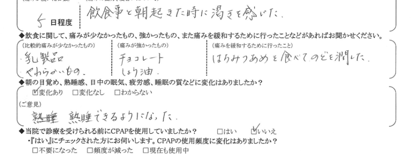 (痛みの程度について)  飲食時と朝起きた時に渇きを感じた。