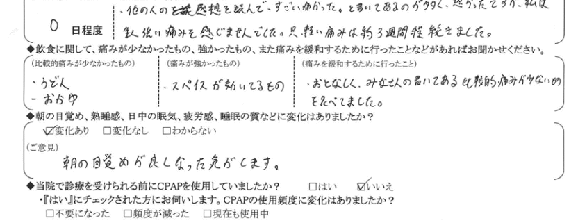 (ご意見) アプリなどで自分の睡眠状態を録音したのを聞いてみたところ、ひどかった時期と比べてだいぶよくなりましたが、症状が全く無くなった訳では無いので、「やや満足」とさせて頂きました。