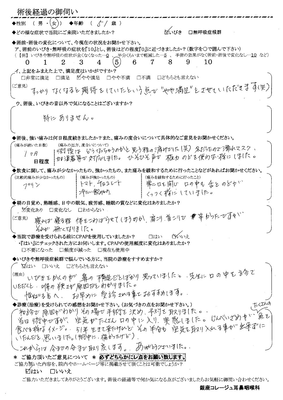 A:初診で原因がわかり、その場で手術することを決め、予約を取りました。手術当日は直後すぐに空気がたくさん口の中に入ってくるのを実感しました。ジンベイザメがたくさんの魚を飲み込んで食べるようにイメージ。51年生きてきたけど、その半分も空気を取り入れることが出来ずにいたんだと思いました。(術中は痛かったけど・・)これからは今までの分まで取り戻します。ありがとうございました。