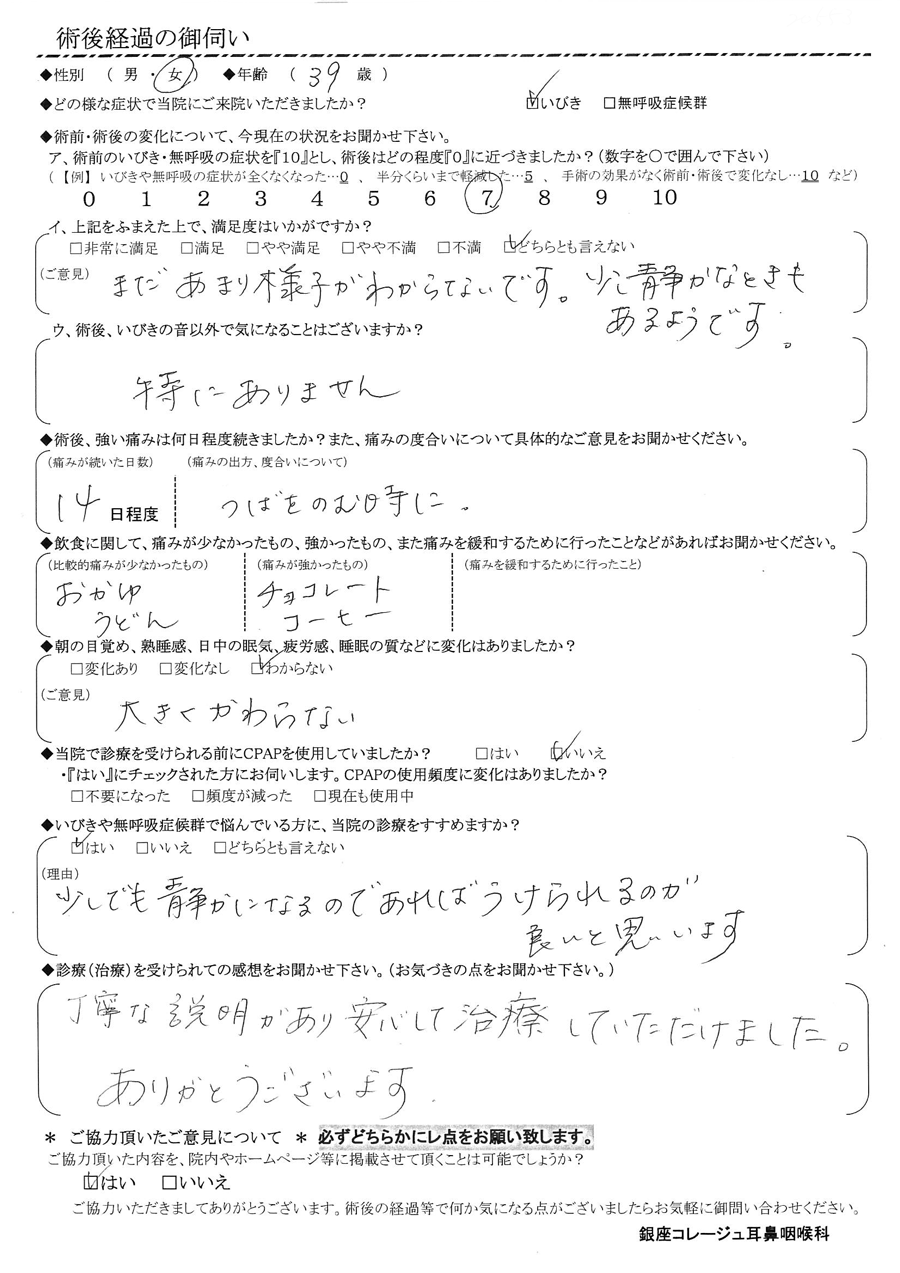 ア, 術前のいびき・無呼吸の症状を『10』だったとすると、術後はどの程度になりましたか? 【7】