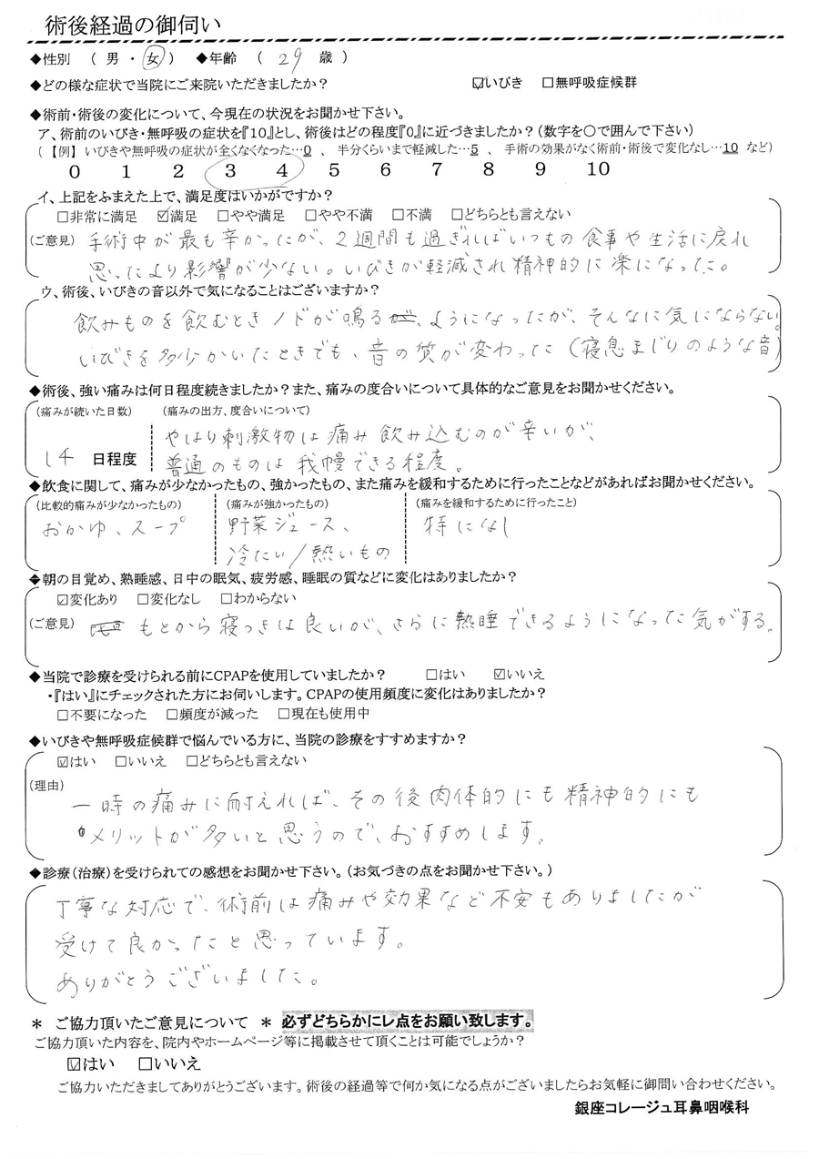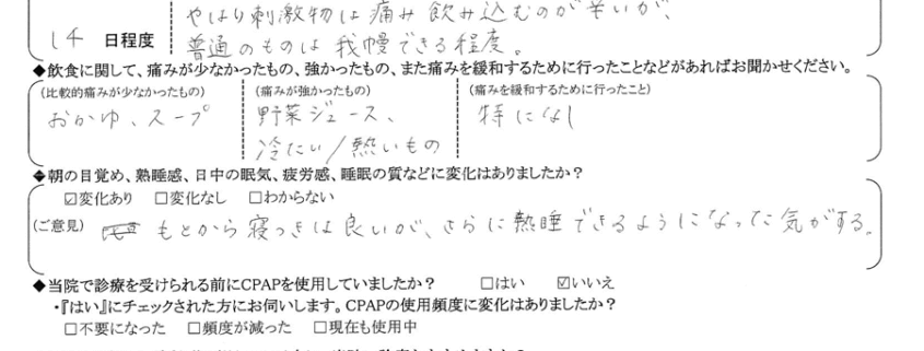 (ご意見) 手術中が最もつらかったが、2週間も過ぎればいつもの食事や生活に戻れ、思ったより影響が少ない。いびきが軽減され、精神的に楽になった。